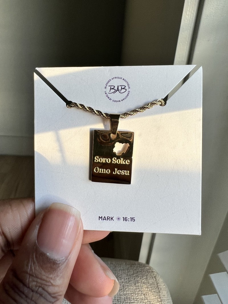 As Christians, it is our calling to address social injustices and vocalize the transformative message of the Gospel of Christ. Beyond raising our voices against societal wrongs, we must echo the profound narrative of God's love and extend invitations to others. “Soro Soke Omo Jesu” encapsulates this mission—Speak up, Child of Jesus. This necklace serves as a symbolic reminder to stand against injustice and actively share the enduring love and grace found in the Gospel. Wear it as a statement of faith and a commitment to being a voice for both justice and the redeeming love of Christ.