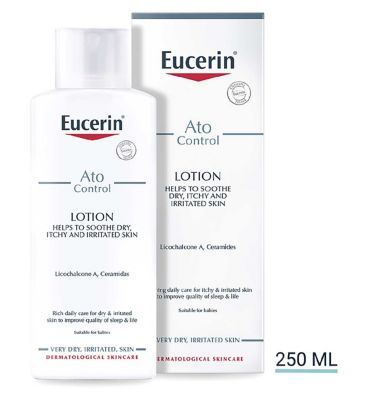 Eucerin AtoControl Body Lotion is specially formulated to soothe, hydrate, and strengthen the skin barrier for those with dry, itchy, or atopic skin. Its gentle, fragrance-free formula is suitable for adults, children, and even babies over 3 months old.