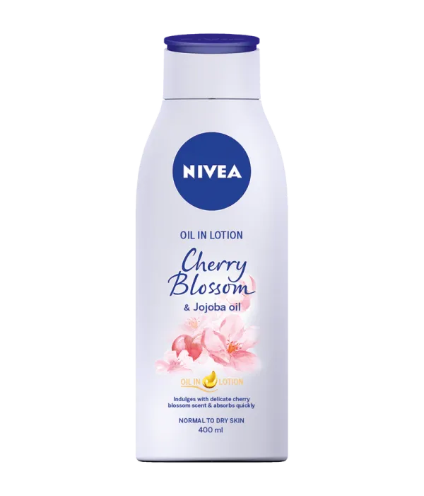 NIVEA Oil in Lotion Cherry Blossom and Jojoba Oil Body Lotion (400ml) This body lotion for dry skin deeply moisturizes for 24+ hours and transforms dry skin into smooth, radiant skin. The fast-absorbing formula in this NIVEA body lotion is infused with jojoba oil and delivers a flowery cherry blossom scent for a luxurious expertise. With this NIVEA body lotion for dry skin, you can awaken your senses and pamper your skin. This daily body lotion can also be used as a hand lotion or foot lotion. To use, smooth lotion over body; apply daily for best results.