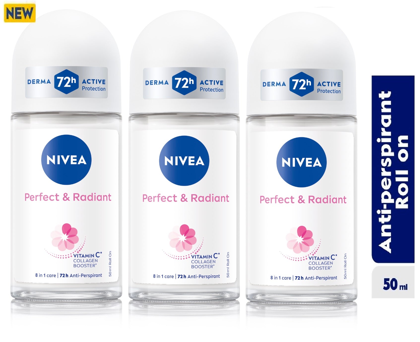 NIVEA Perfect & Radiant Roll-On is enriched with Vitamin C and a collagen booster to hydrate, smooth, and enhance skin tone. It not only keeps underarms protected but also helps reveal radiant, even-toned skin with daily use.