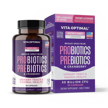 Doctor-formulated probiotic blend combining prebiotics, cranberry extract, and lactoferrin to support digestive balance, urinary tract health, and immune defense.